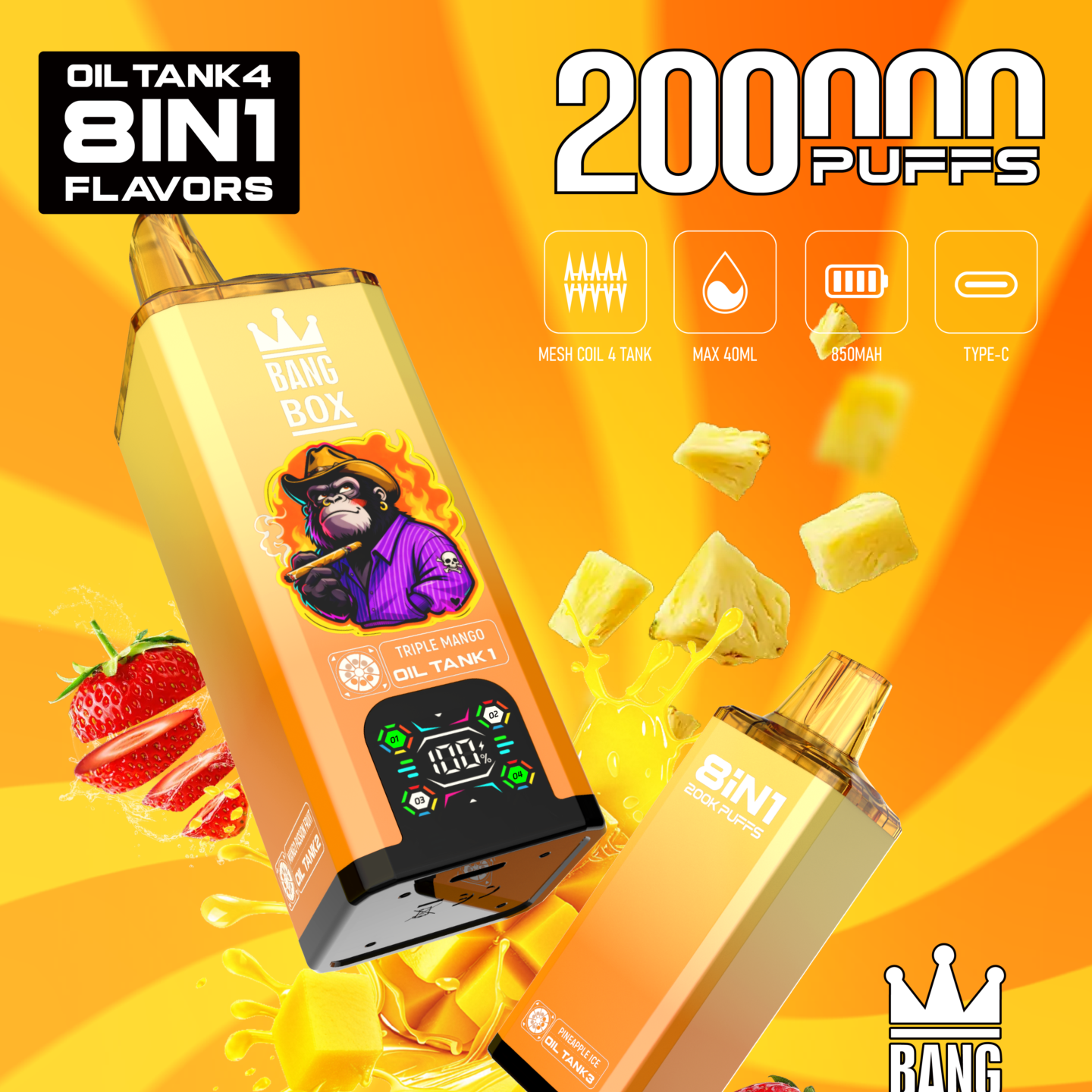 The Bang Box 200000 is a powerhouse in the vaping market because it offers a massive life and smart features. Many users want a device that shows exactly how much oil and battery is left. Luckily, the Bang Box 200000 has a clear digital display for your convenience. Because it features a huge 100ml e-liquid capacity divided into four tanks, you can enjoy many flavor mixes. Furthermore, it gives you up to 200,000 puffs, so you do not need to replace it for a long time. It also uses a high-performance 850mAh pure cobalt battery for strong power. You can choose between a 0.8 ohm single draw or a 0.4 ohm double draw for a richer taste. So, every hit is smooth and full of flavor. Then, you can use the Type-C port to charge the device quickly. We also offer OEM/ODM services for those who want to build their own brand. Now, you can get a reliable, high-quality product that works perfectly every single time.