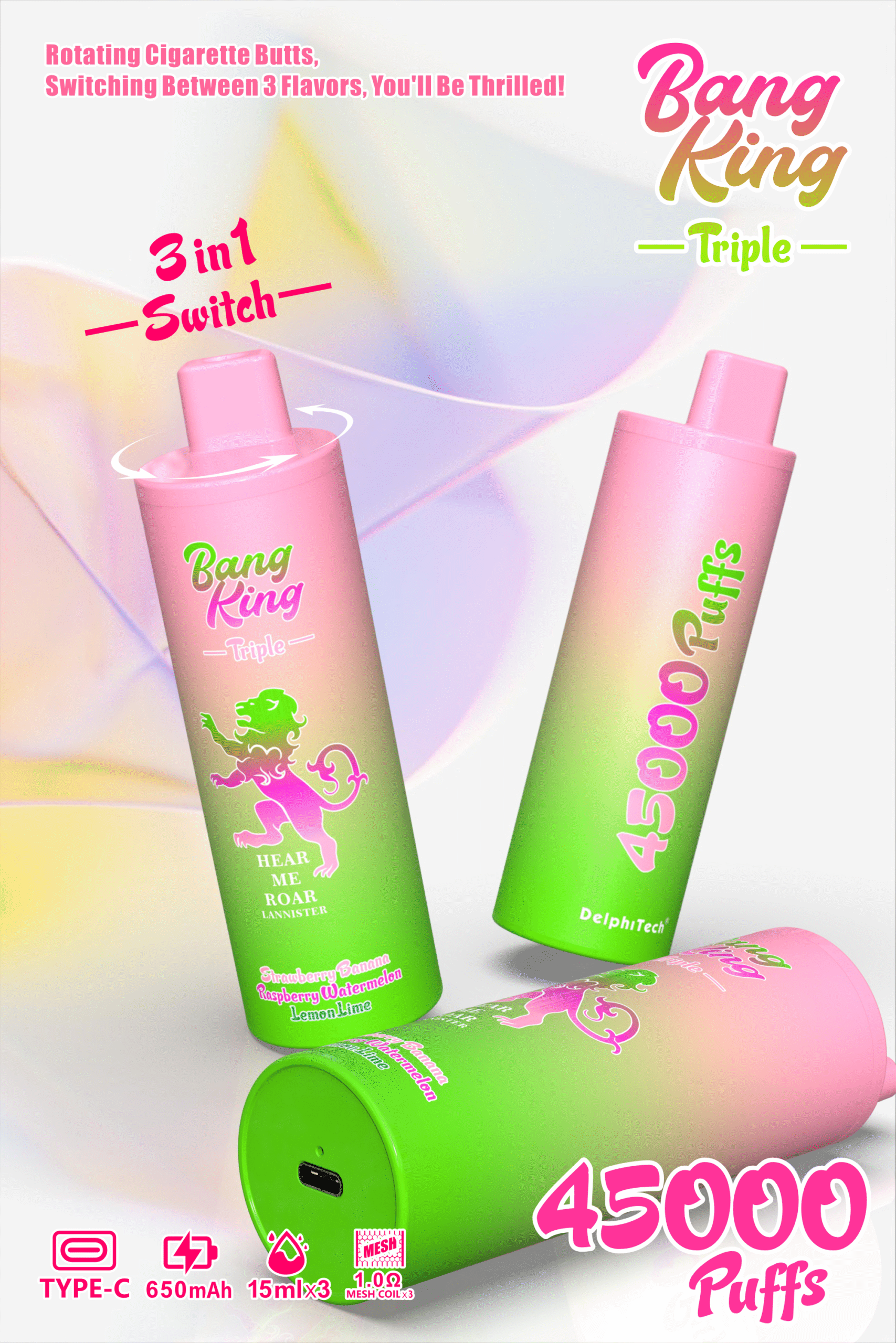 Bang King Triple 45000 (3 In 1) PUFF: Triple Flavor Revolution, Mesh Coil Dual Tank and a 650mAh Rechargeable Battery